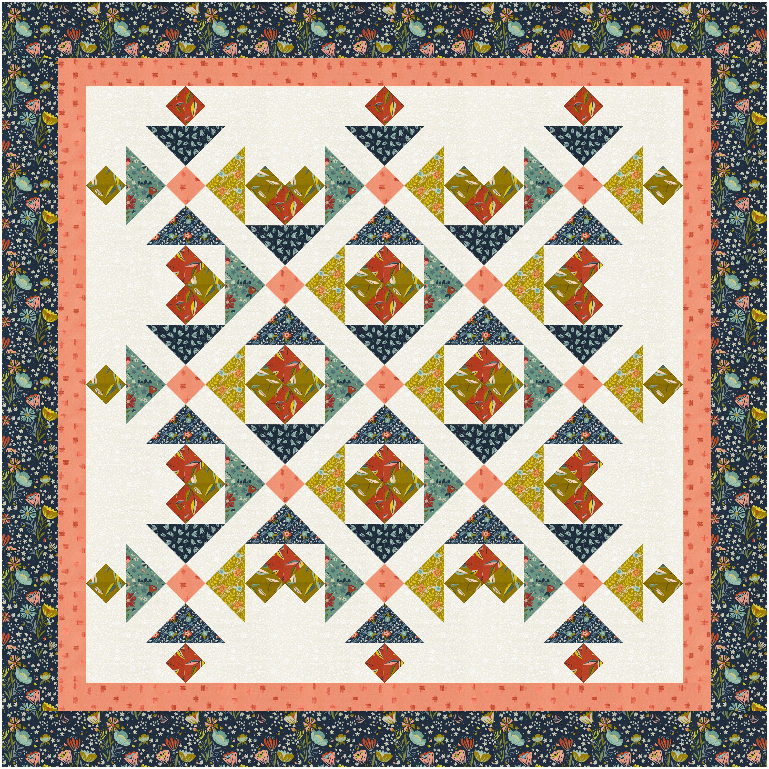 This pattern is for a pretty, little lap quilt with a single repeating block set on point. If you’ve never done a quilt on point, this would be a good place to start. You can completely change the look of a quilt just by rotating a block onto its corner and doing so is easier than it might seem. This quilt uses six fat quarters with an accent fabric to make a jeweled design. I was inspired by the spring arrival of birds in their bright iridescent feathers flashing and sparking in the sunlight. I especially love watching the feathers of hummingbirds seemingly change colors with the angle of sunlight reflection.