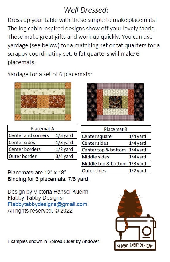 Well Dressed Quilted Placemat Pattern by Flabby Tabby Designs – paper/hard copy pattern. Directions to make a set of six 12 x 18 inch quilted placemats. Beginner friendly and super easy!