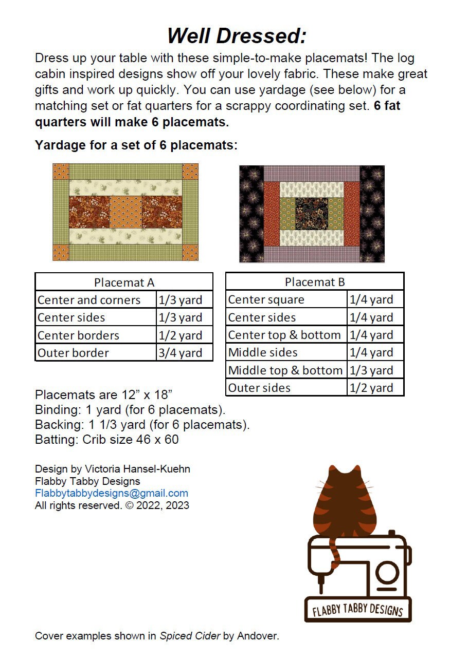 Well Dressed Quilted Placemat Pattern by Flabby Tabby Designs – PDF DIGITAL DOWNLOAD pattern.