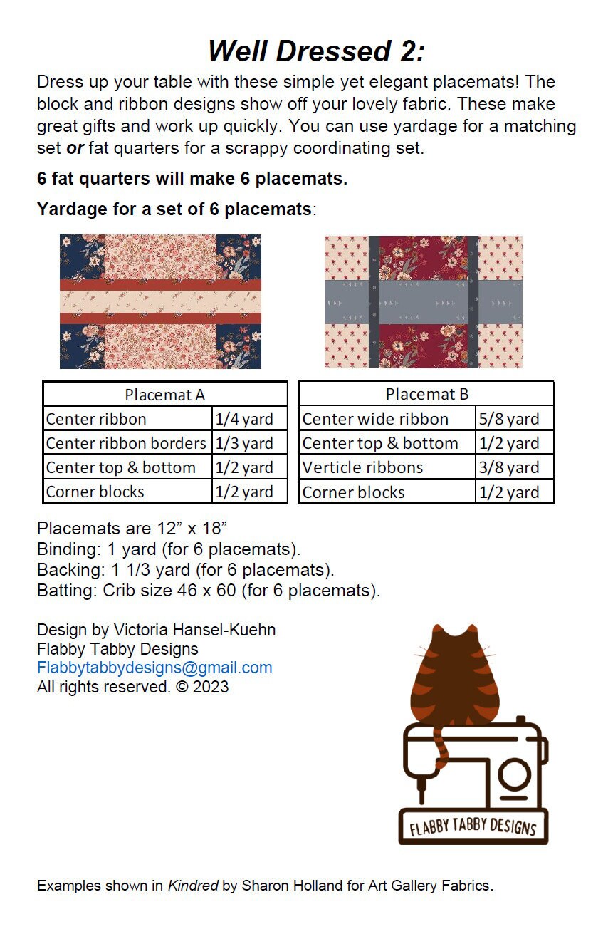 Well Dressed 2 Quilted Placemat Pattern by Flabby Tabby Designs – paper/hard copy pattern. Directions to make a set of six 12 x 18 inch quilted placemats. Beginner friendly and super easy!