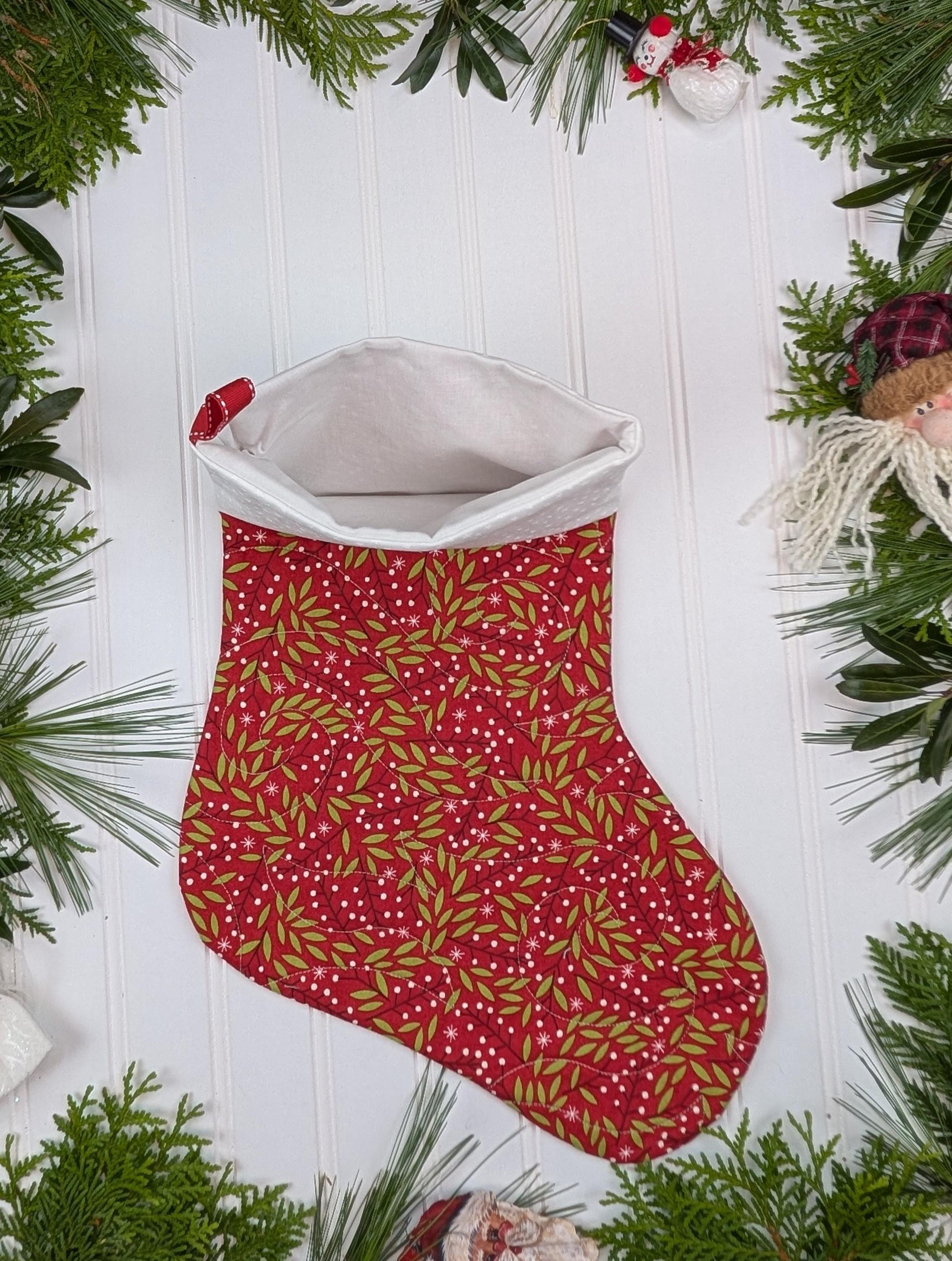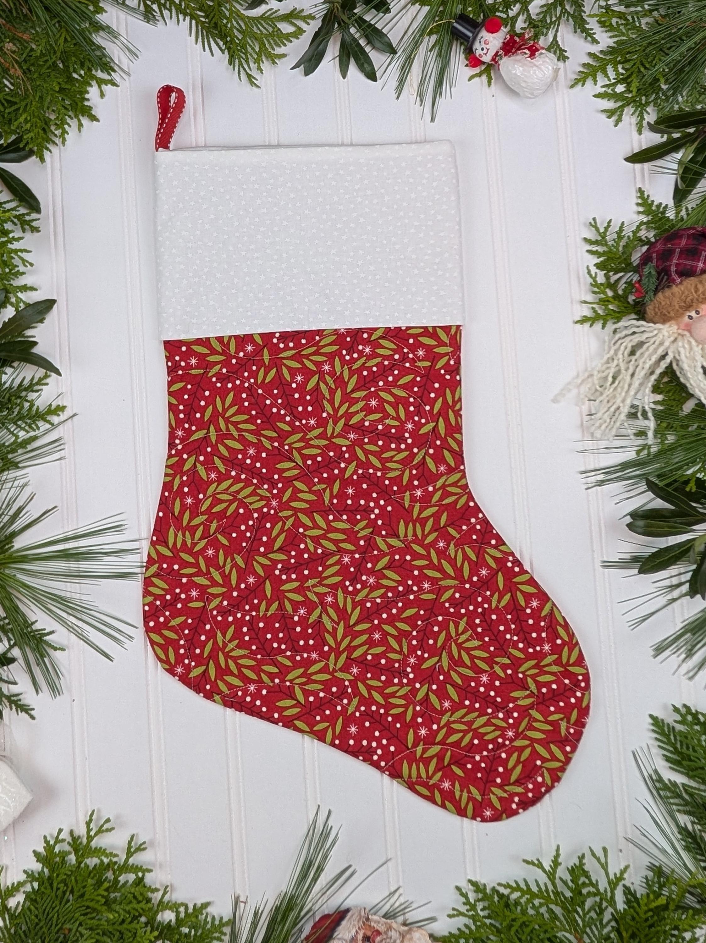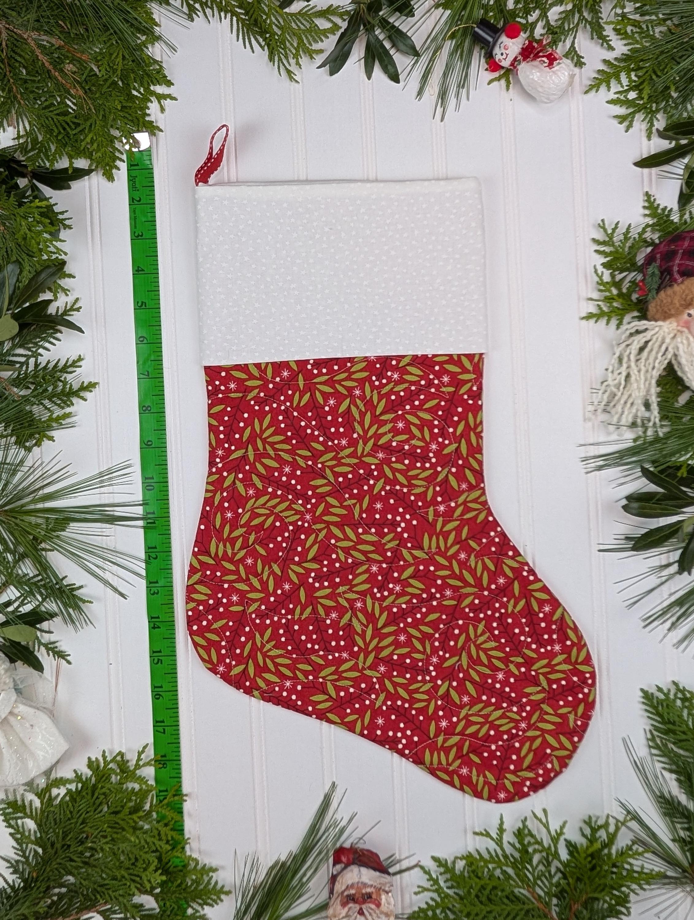 Fully lined and made from high quality quilt cotton fabric. The front of the stocking is quilted. The back of the stocking is not quilted (this makes the stocking keep its shape better). The poly batting used for the quilted front is Quilter’s Dream Green that is 100% recycled from plastic bottles. Hanging loop is made from polyester ribbon. Fabric front and back is Merriment by Gingiber for Moda.