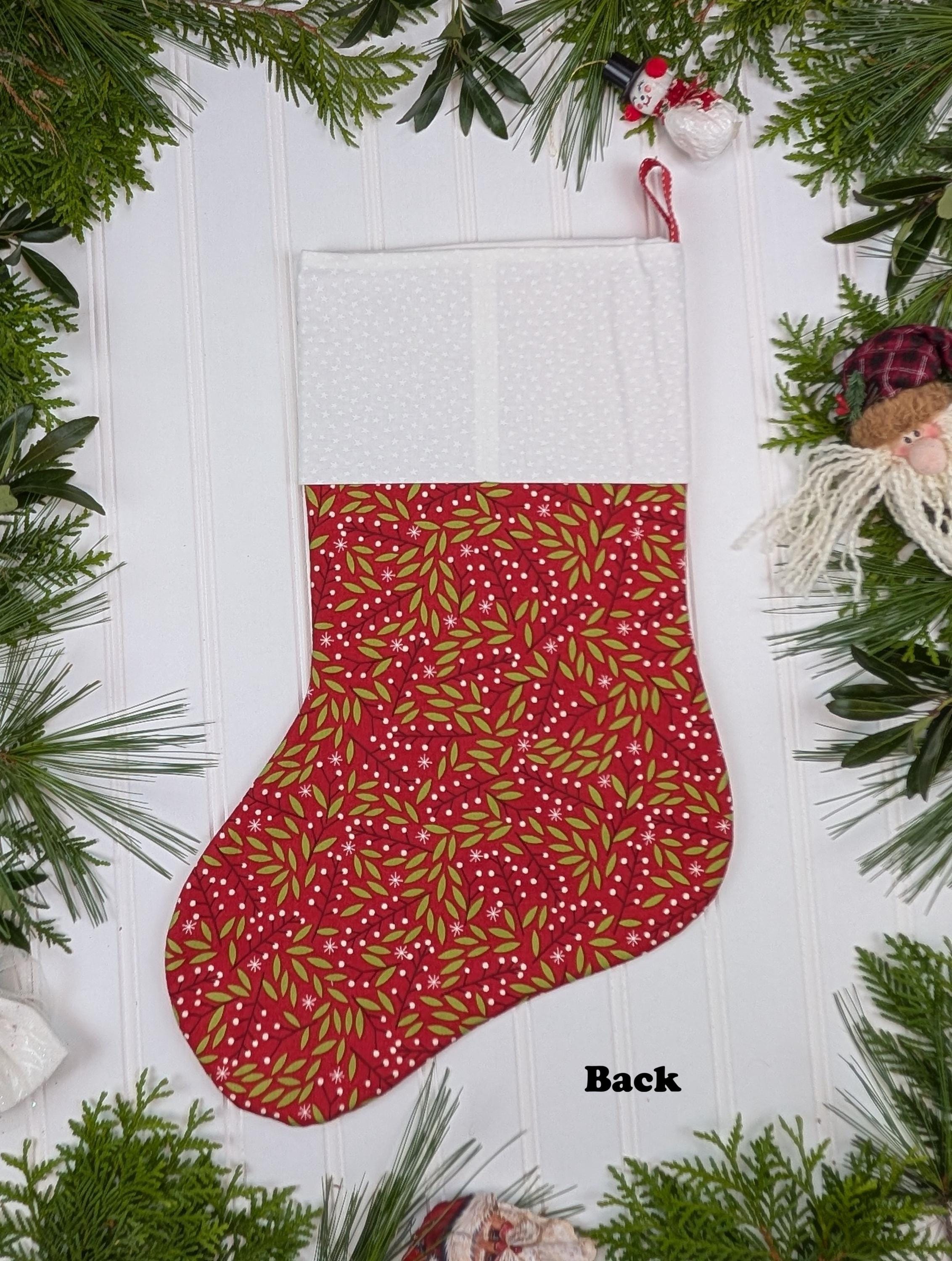 Note: This is a handmade stocking sewn by a human using a sewing machine and may have small flaws or slight differences. Colors may vary slightly from what you see on your screen. Computer or phone screens can make slight changes in color – it is common for the phone to brighten pictures. Greenery and ornaments in the photo are not included in this purchase.