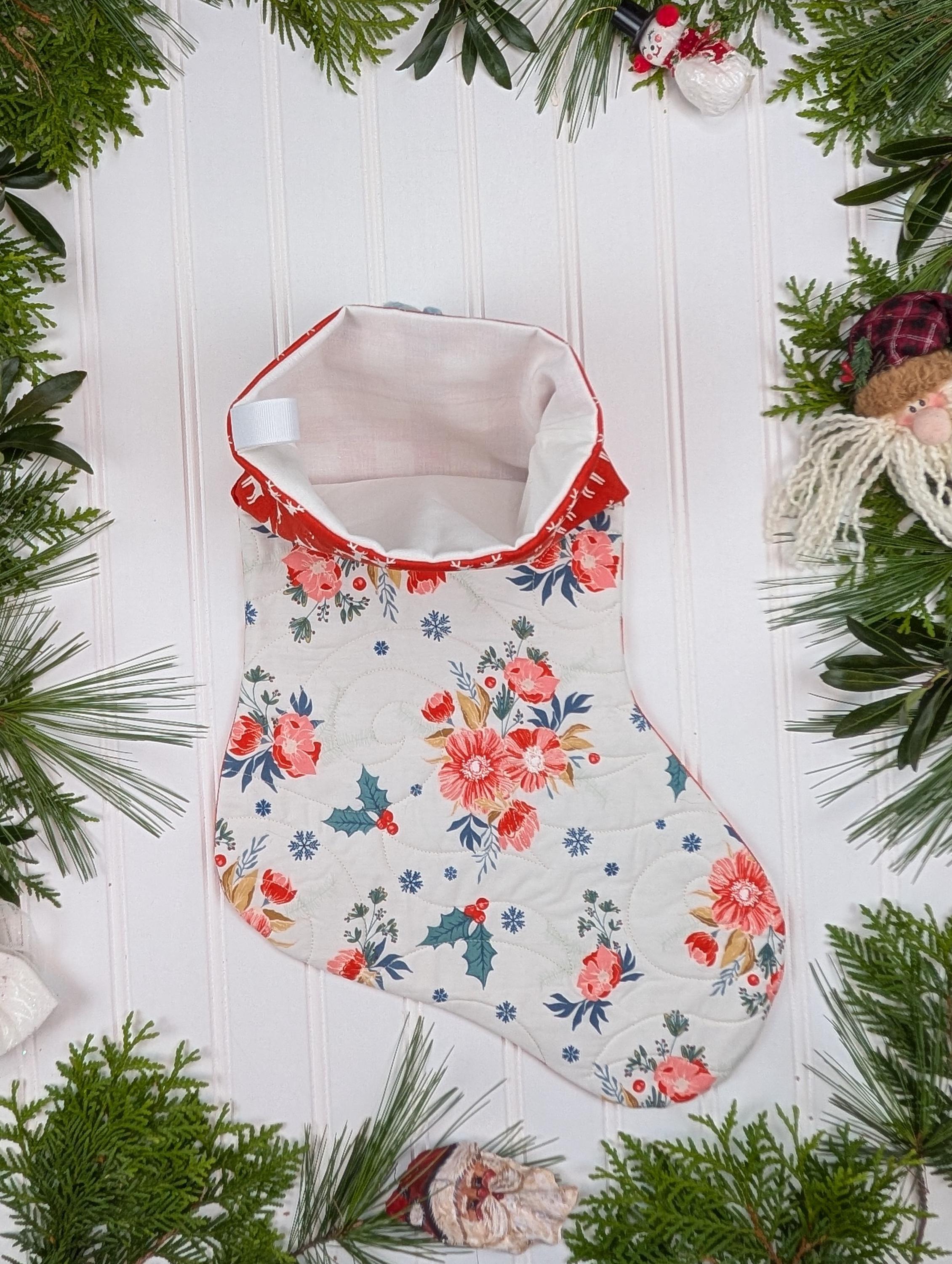 Fully lined and made from high quality quilt cotton fabric. The front of the stocking is quilted. The back of the stocking is not quilted (this makes the stocking keep its shape better). The poly batting used for the quilted front is Quilter’s Dream Green that is 100% recycled from plastic bottles. Hanging loop is made from polyester ribbon. Fabric is Cozy and Joyful by Maureen Cracknell for Art Gallery Fabrics.
