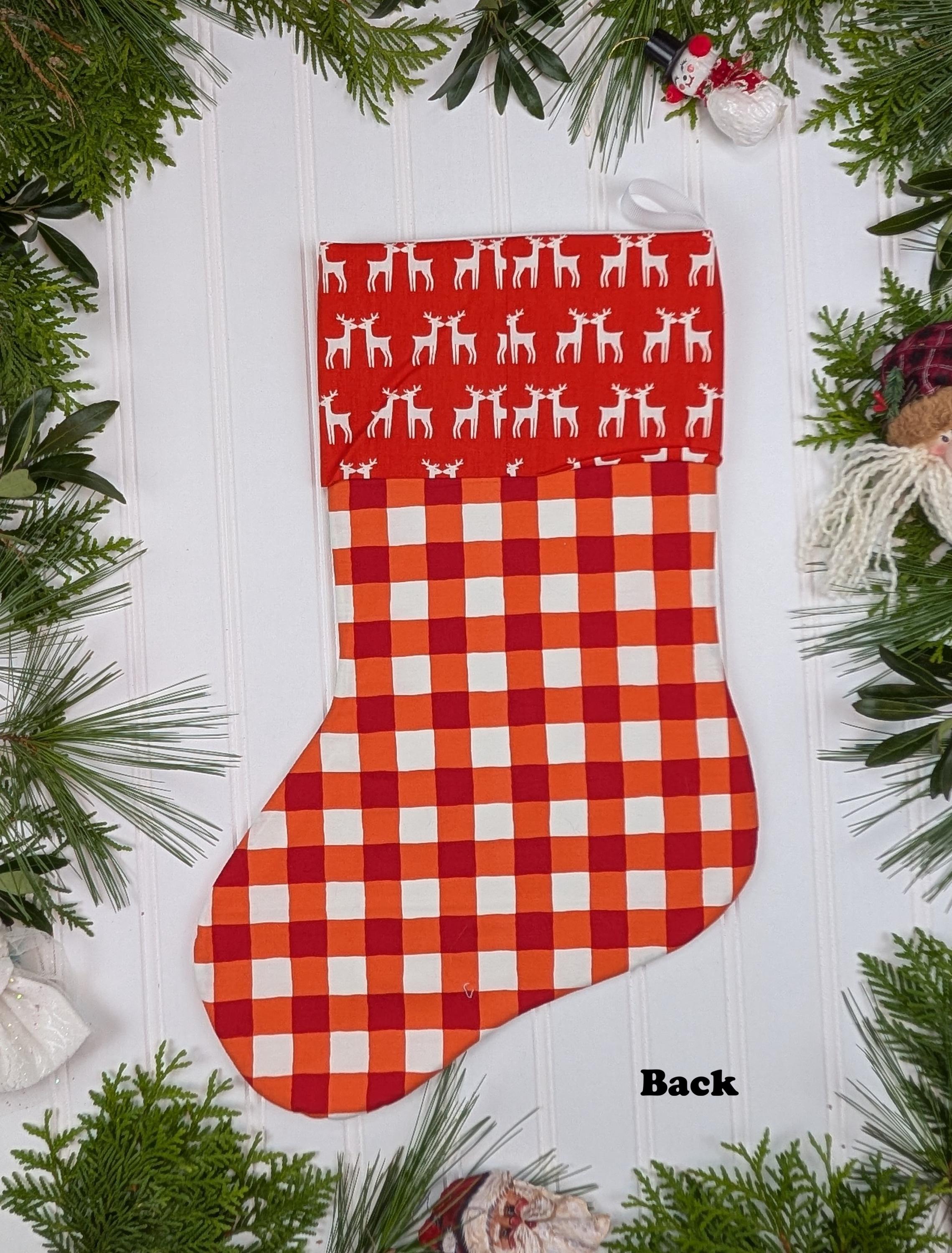 Note: This is a handmade stocking sewn by a human using a sewing machine and may have small flaws or slight differences. Colors may vary slightly from what you see on your screen. Computer or phone screens can make slight changes in color – it is common for the phone to brighten pictures. Greenery and ornaments in the photo are not included in this purchase.