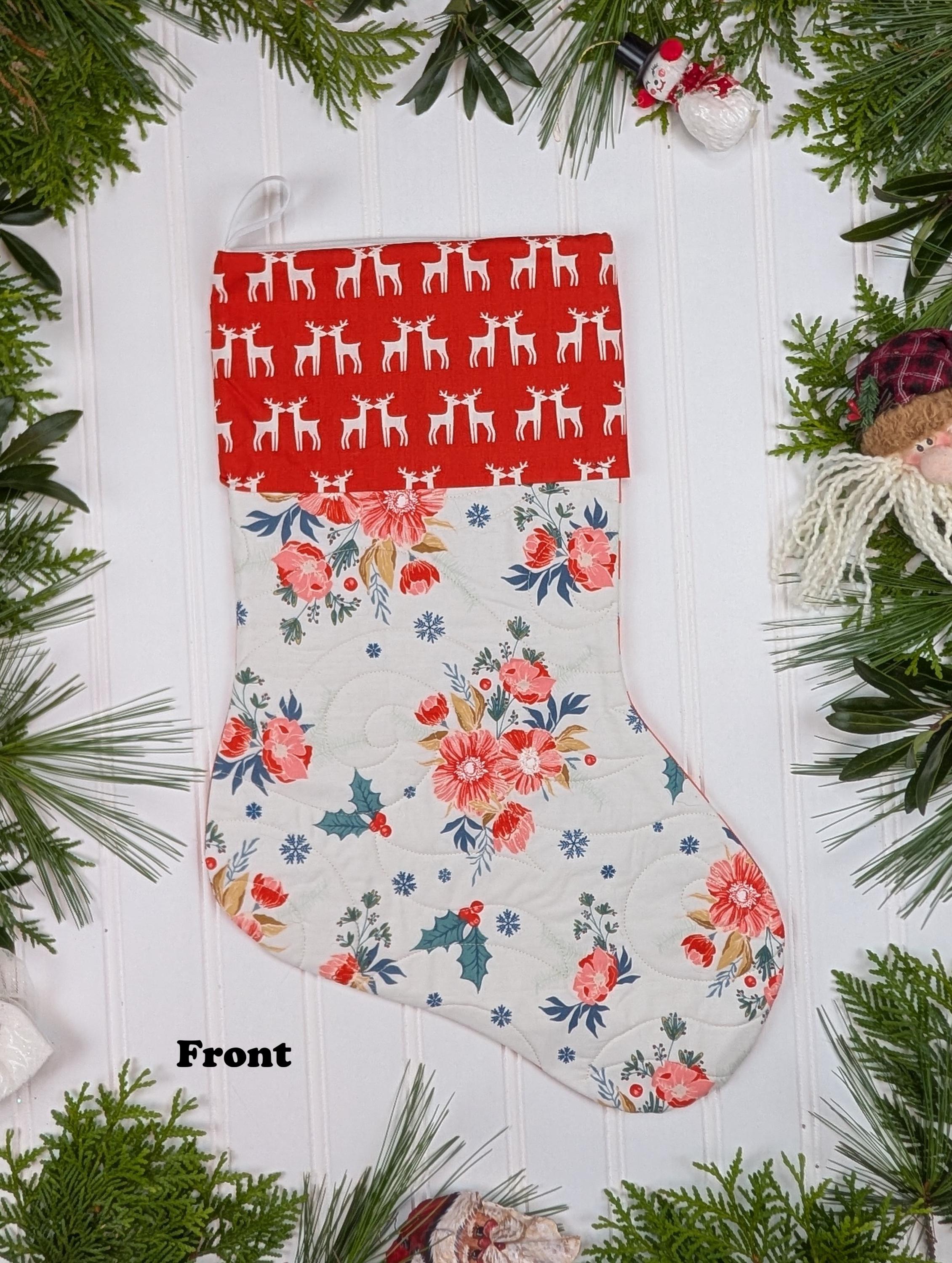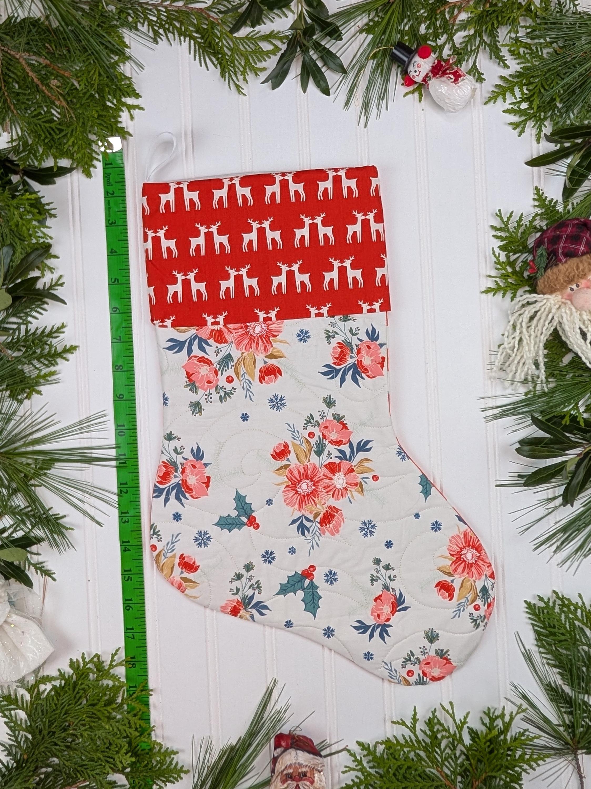 This stocking measures approximately 7-8 inches wide at the top, 17-18 inches long, and 12 inches wide from heel to toe. Sewn here at the Flabby Tabby Designs studio in Athens, West Virginia and long arm quilted at The Sewing Gallery in Princeton, West Virginia. Made from the Sugarplum Stocking Pattern by Flabby Tabby Designs (available to purchase in our Etsy shop in either hard copy or digital download).