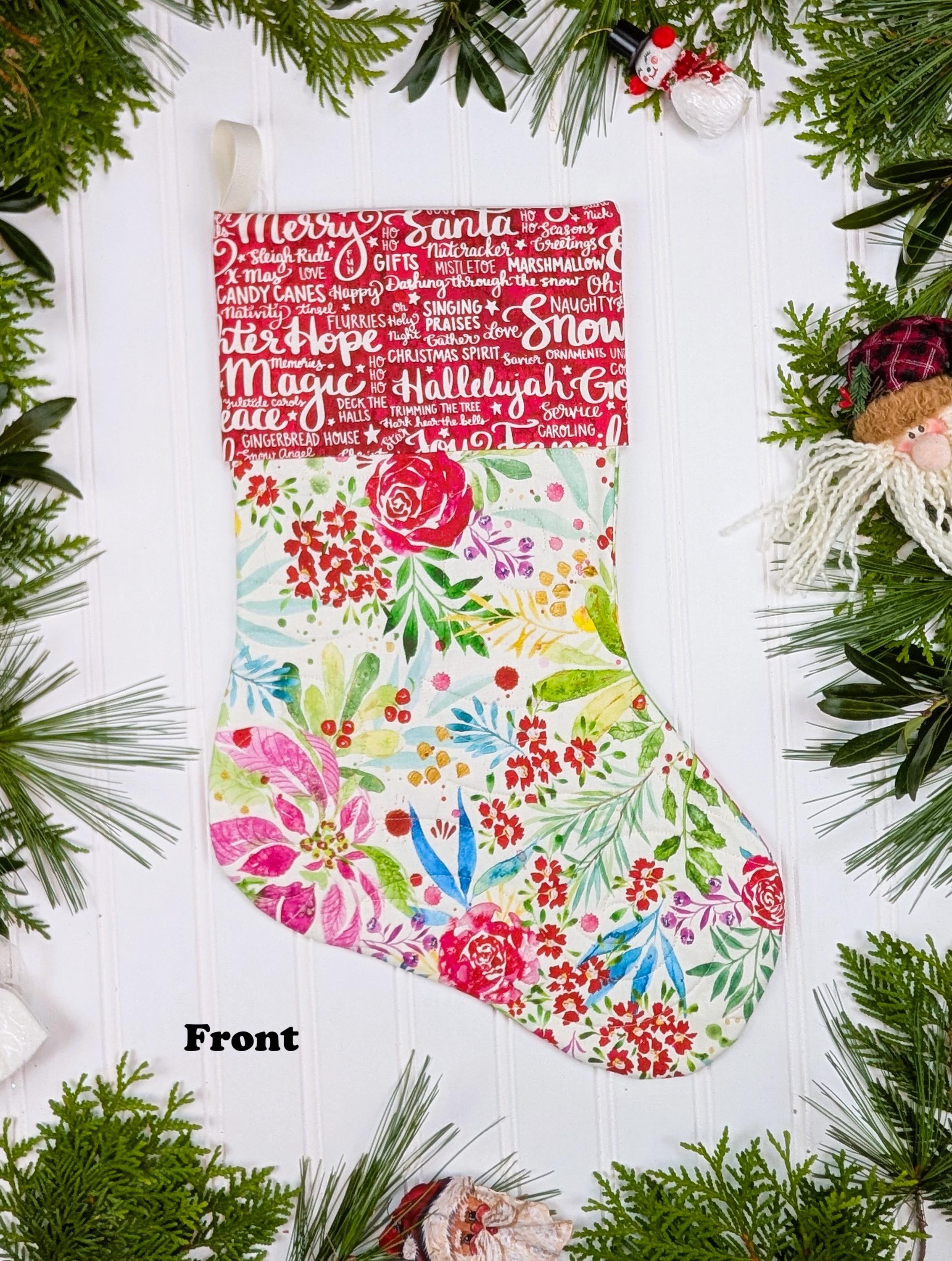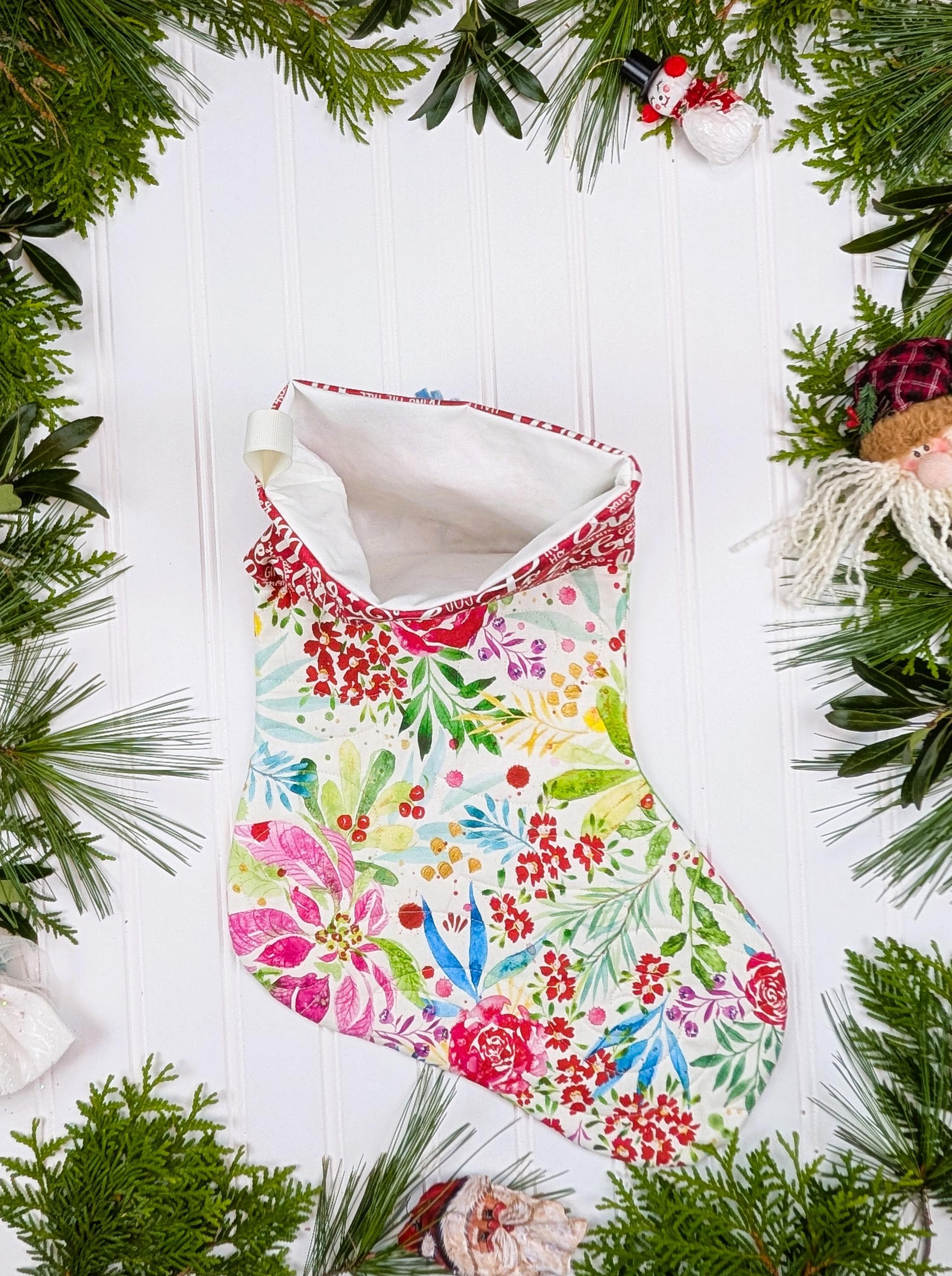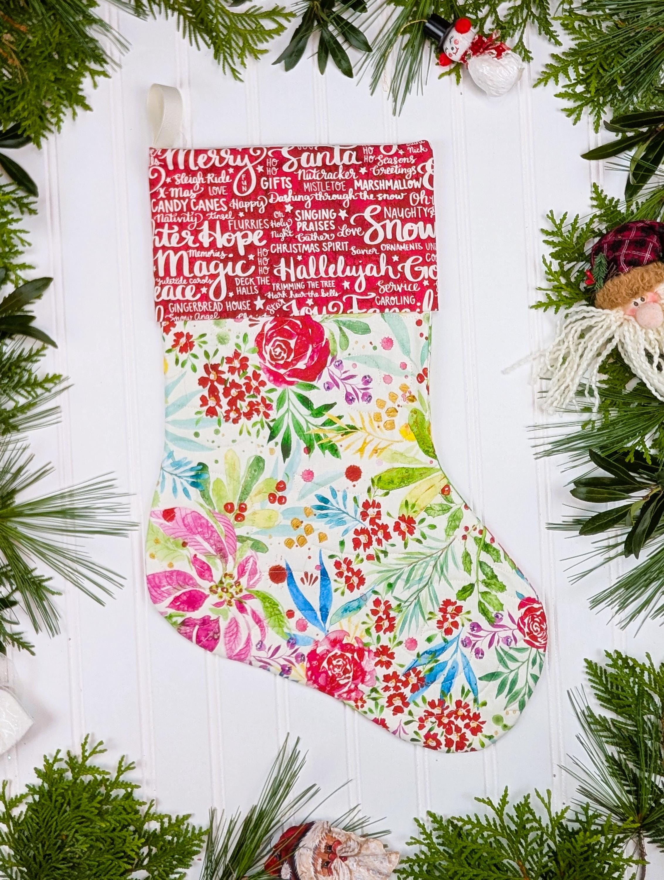 Handmade Quilted Christmas Stocking Lined with Cuff - Comfort and Joy Create Joy Project Moda - Poinsettia Floral Fabric