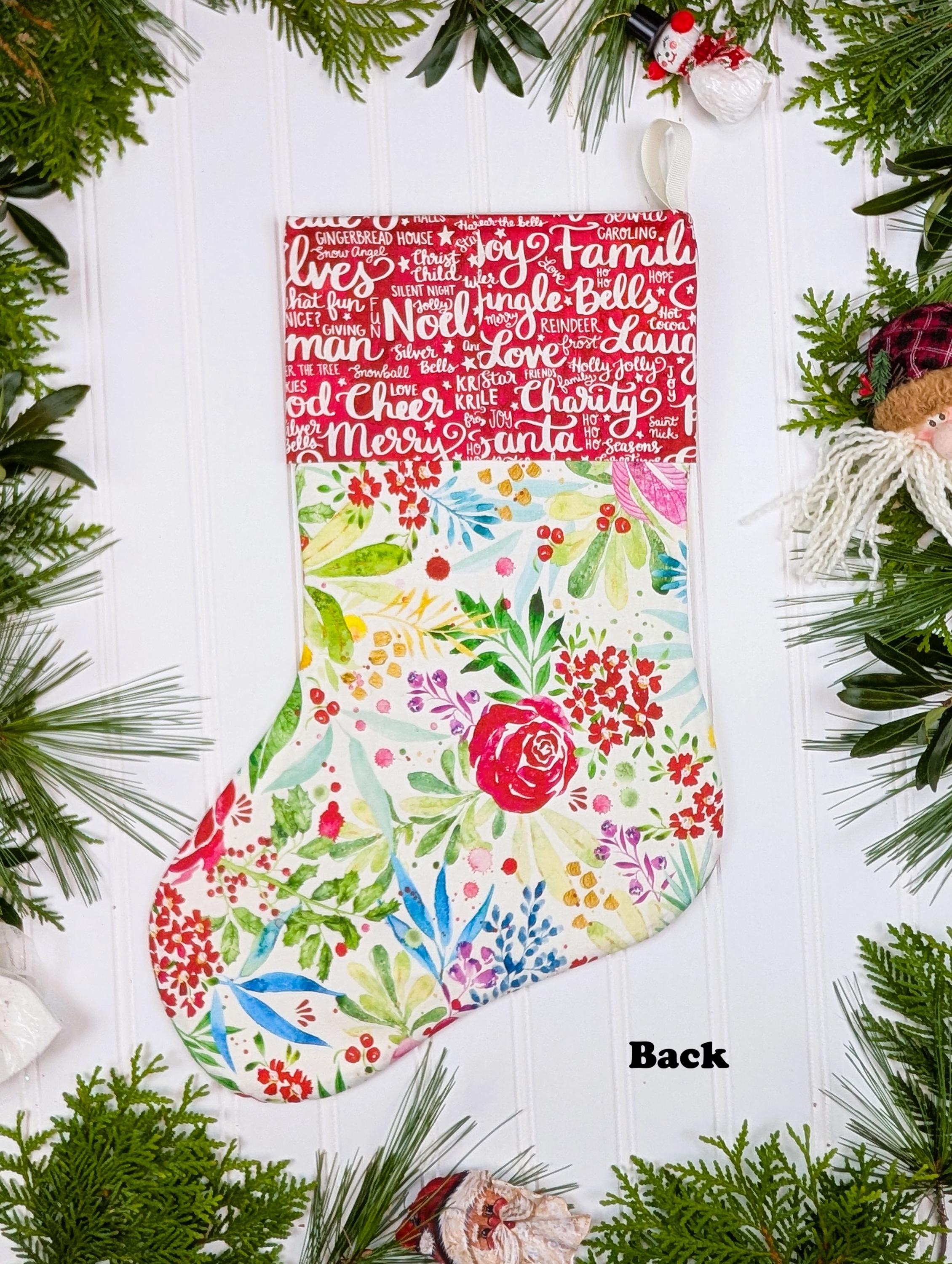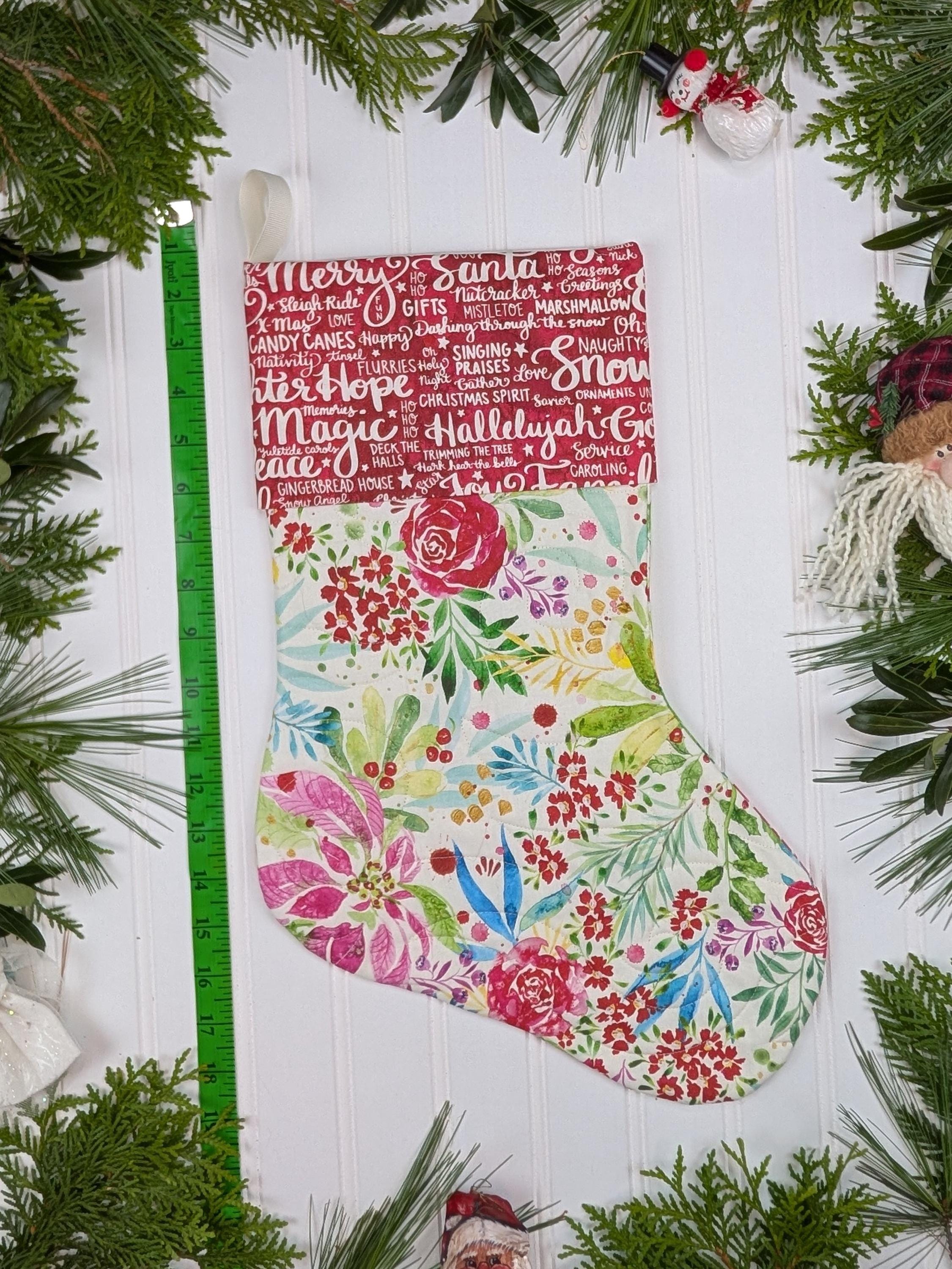 Note: This is a handmade stocking sewn by a human using a sewing machine and may have small flaws or slight differences. Colors may vary slightly from what you see on your screen. Computer or phone screens can make slight changes in color – it is common for the phone to brighten pictures. Greenery and ornaments in the photo are not included in this purchase.