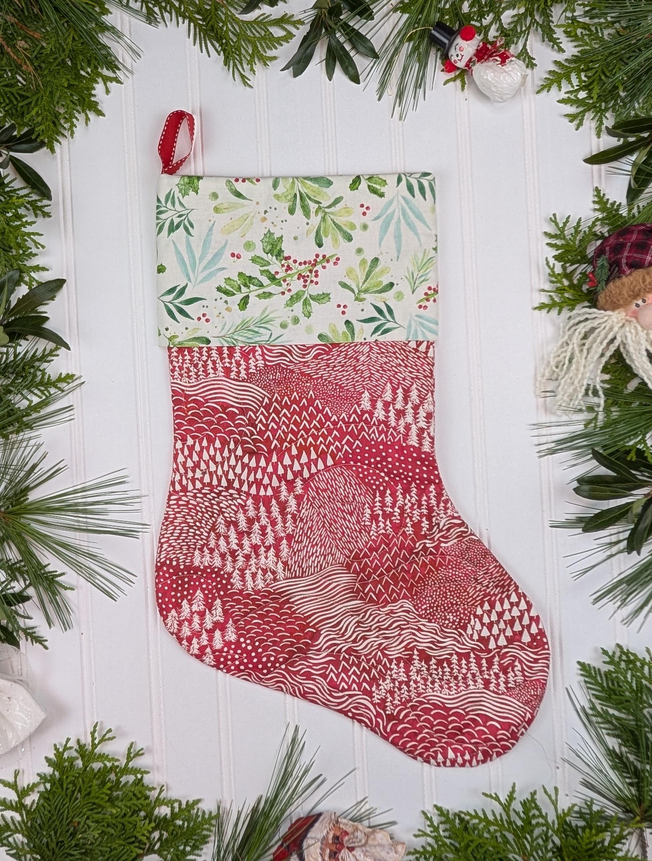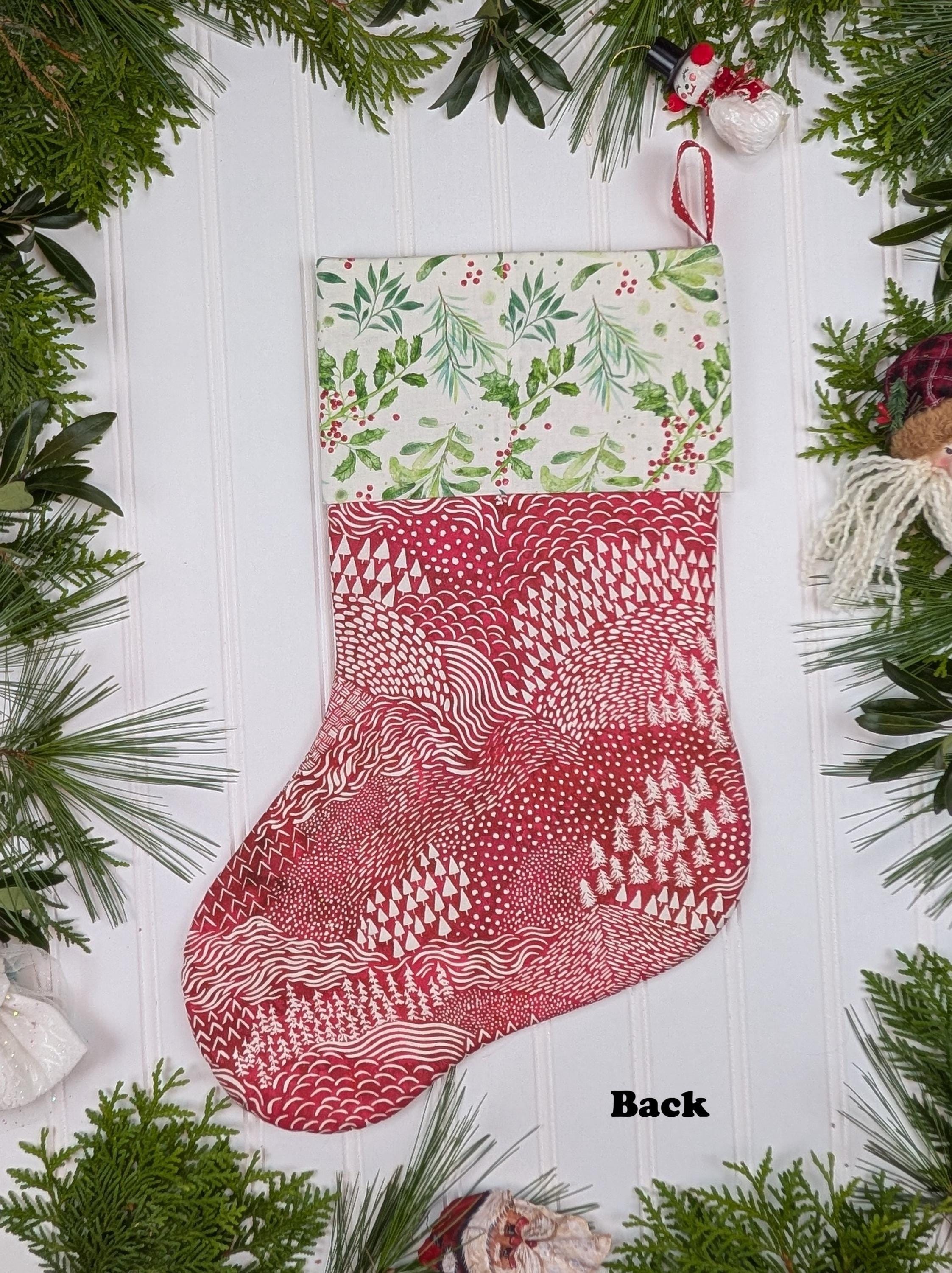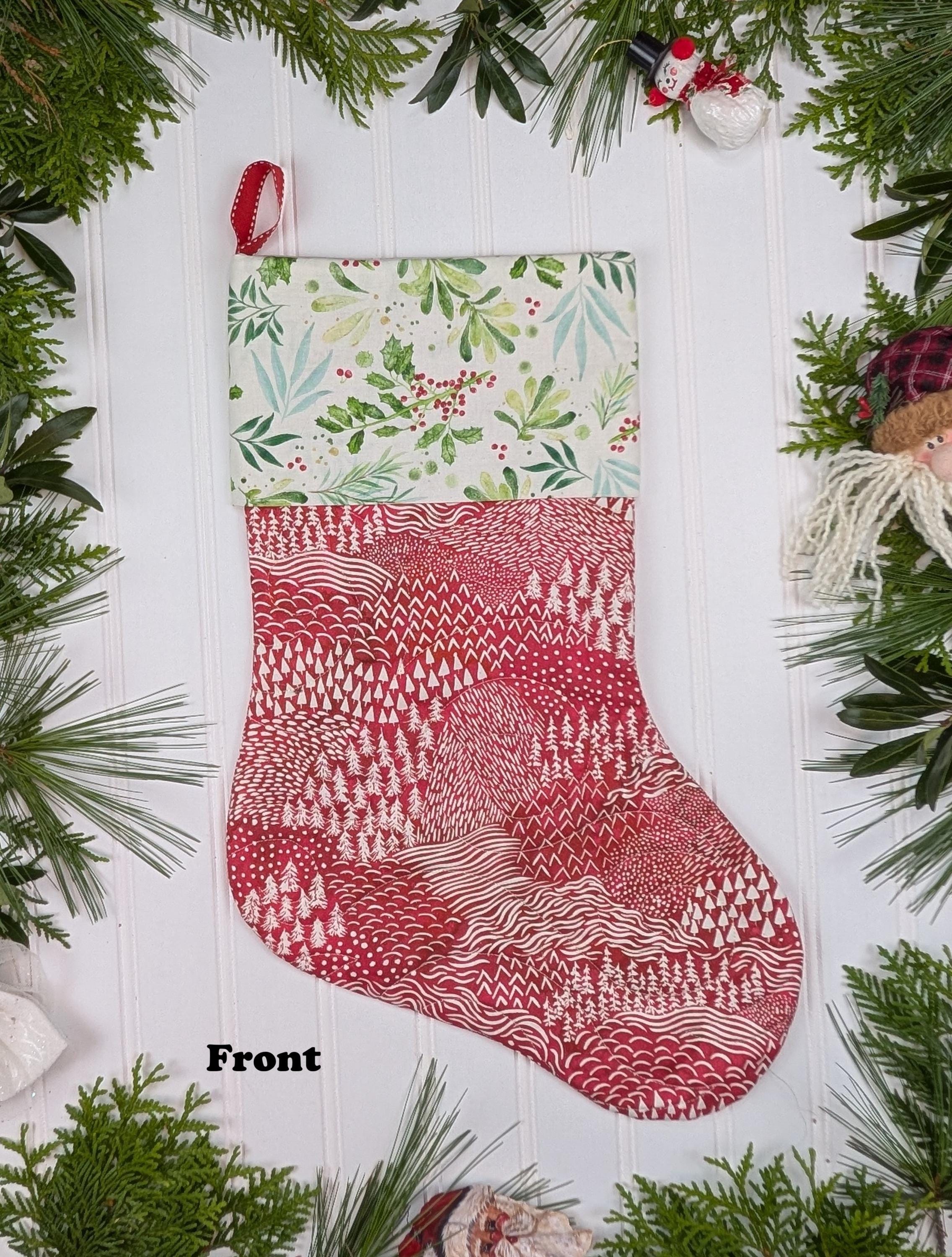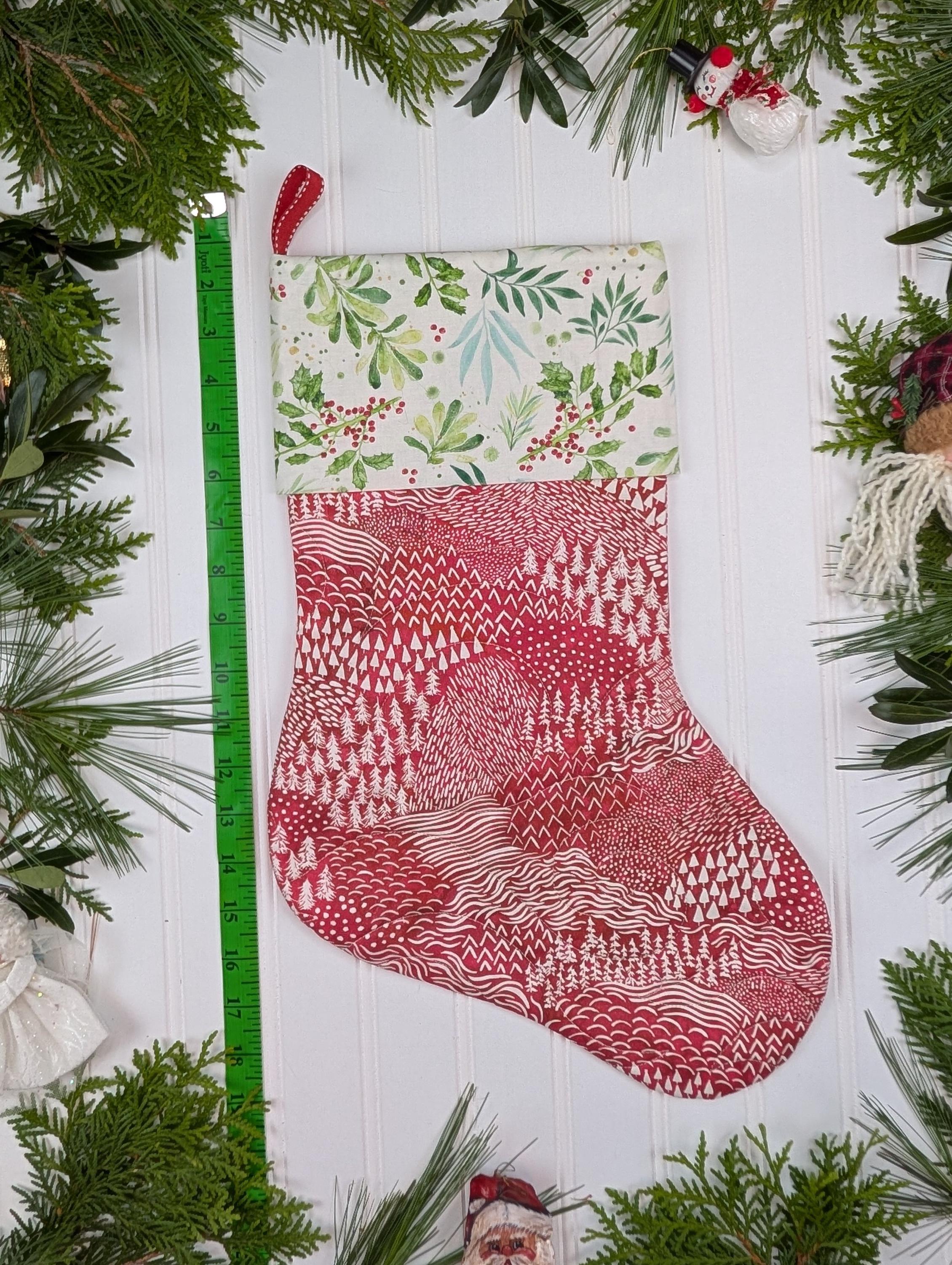 Note: This is a handmade stocking sewn by a human using a sewing machine and may have small flaws or slight differences. Colors may vary slightly from what you see on your screen. Computer or phone screens can make slight changes in color – it is common for the phone to brighten pictures. Greenery and ornaments in the photo are not included in this purchase.
