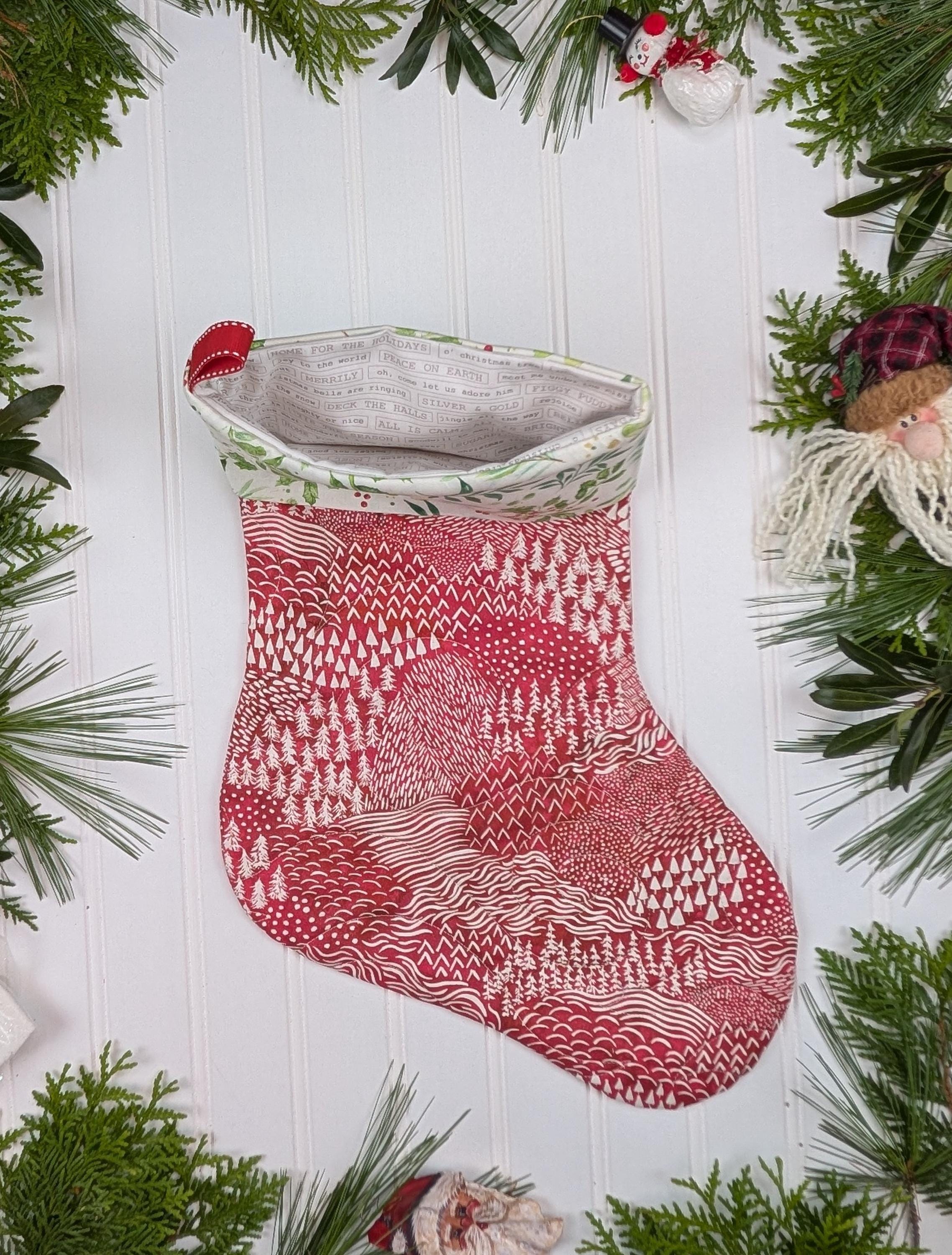 Fully lined and made from high quality quilt cotton fabric. The front of the stocking is quilted. The back of the stocking is not quilted (this makes the stocking keep its shape better). The poly batting used for the quilted front is Quilter’s Dream Green that is 100% recycled from plastic bottles. Hanging loop is made from polyester ribbon. Fabric is Comfort and Joy by Create Joy Project for Moda.