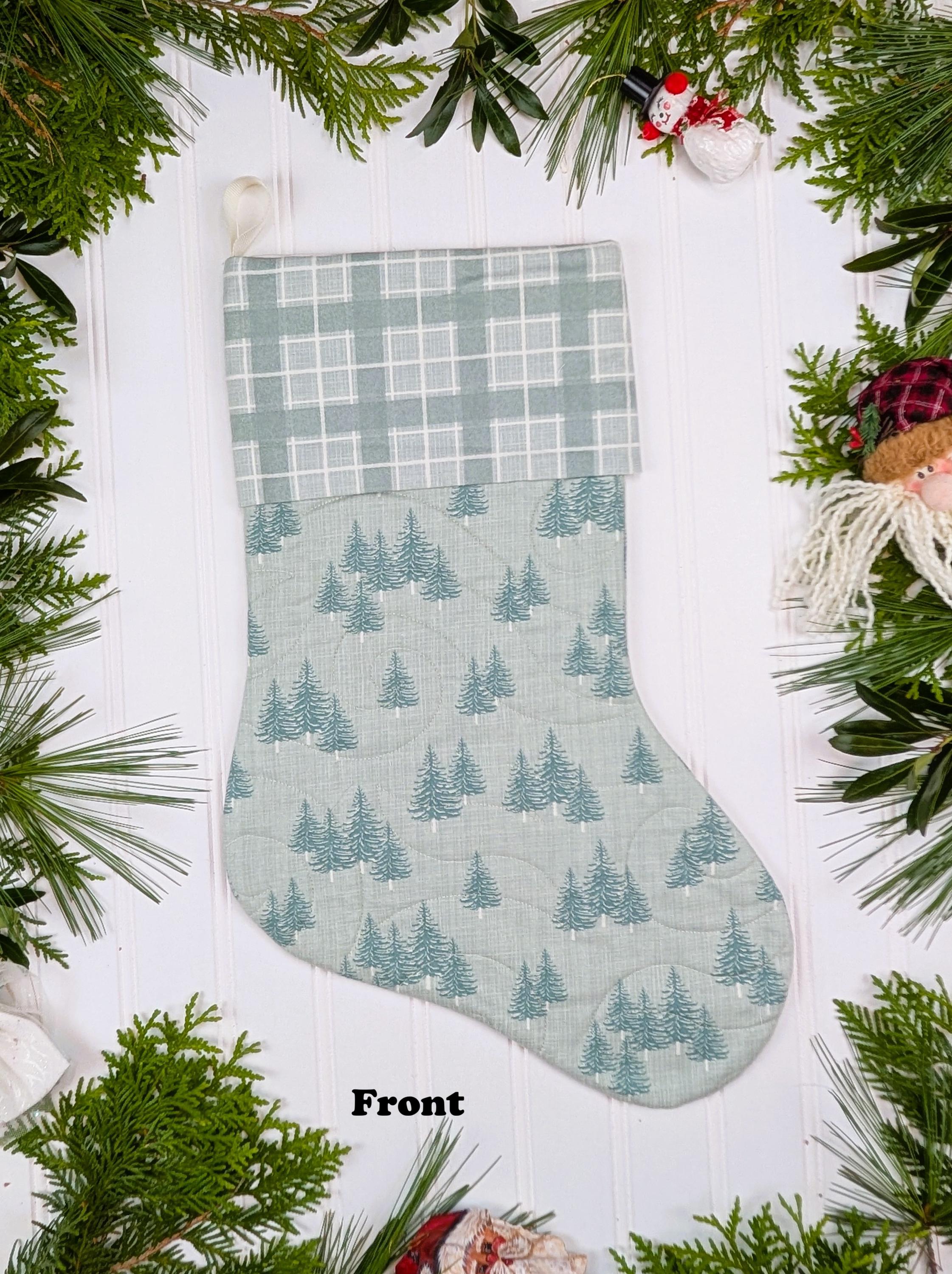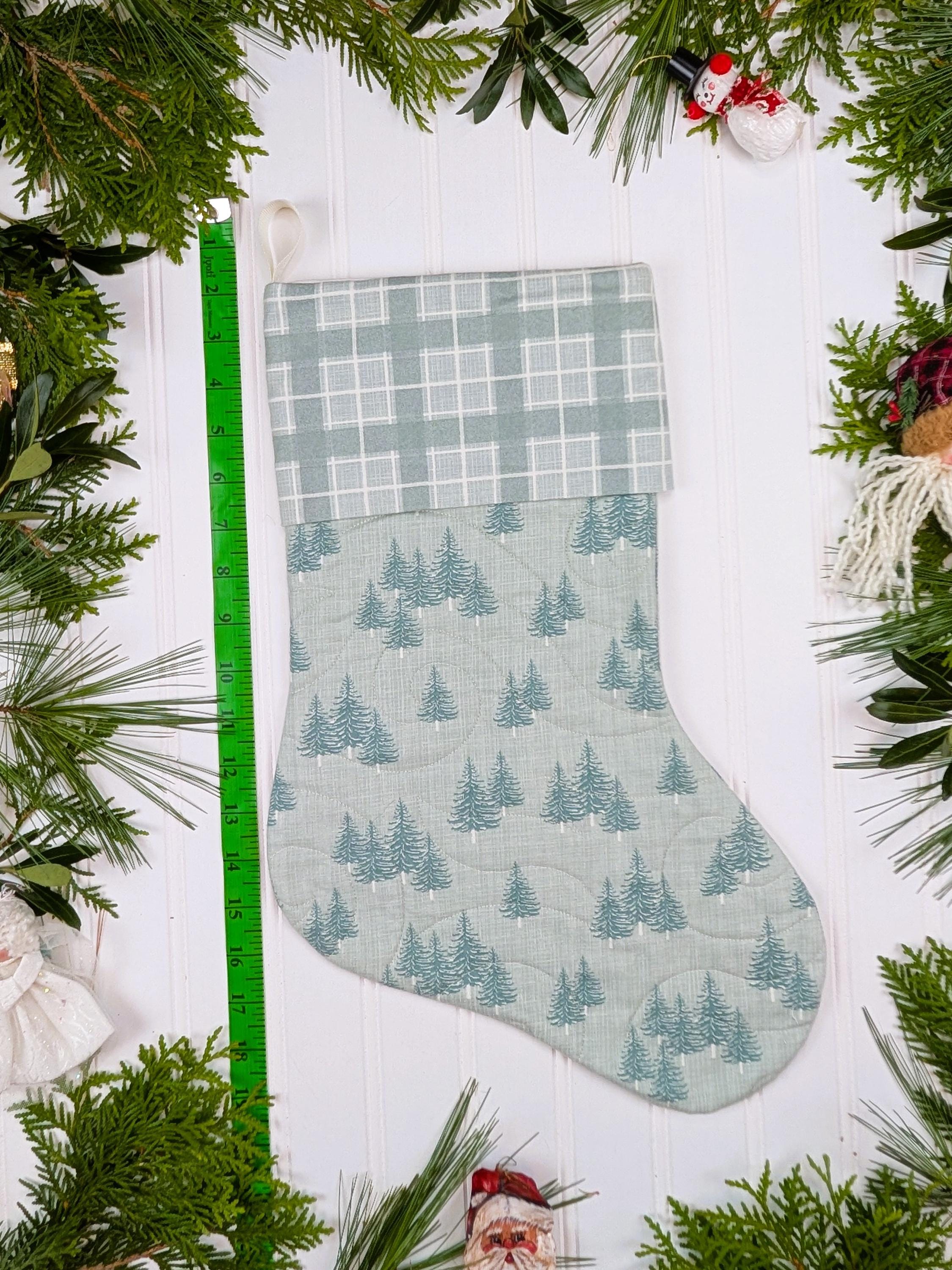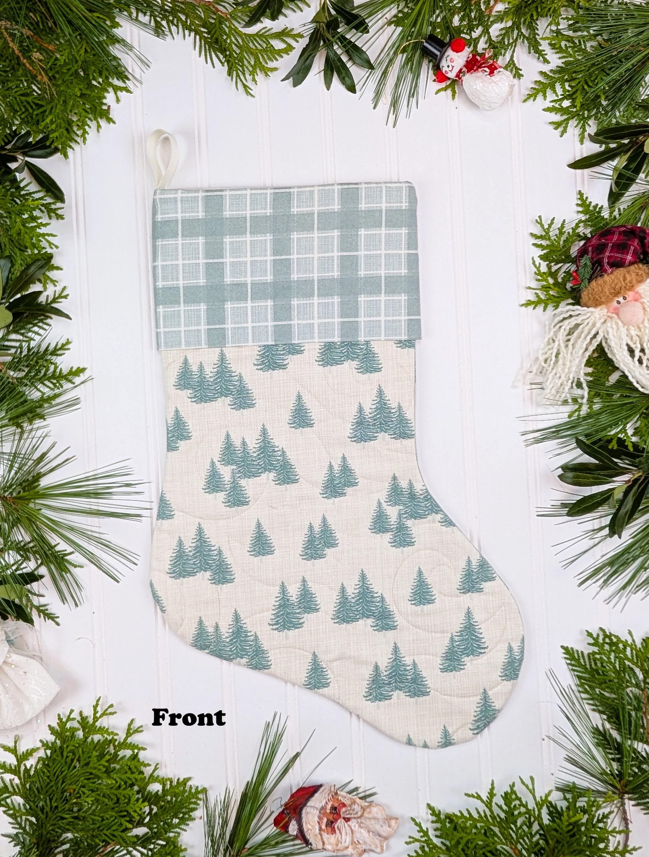 Fully lined and made from high quality quilt cotton fabric. The front of the stockings is quilted. The back of the stockings is not quilted (this makes the stocking keep its shape better). The poly batting used for the quilted front is Quilter’s Dream Green that is 100% recycled from plastic bottles. Hanging loop is made from polyester ribbon. Fabric is Juniper by Kate and Birdie for Moda which is a brushed cotton. Brushed cotton is almost like flannel but not as thick.
