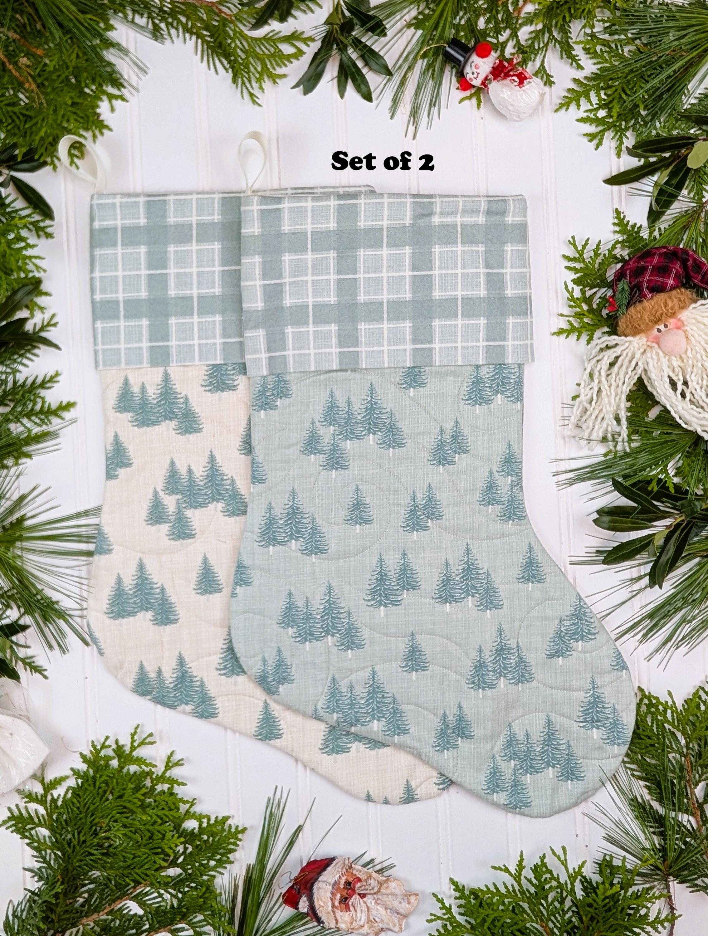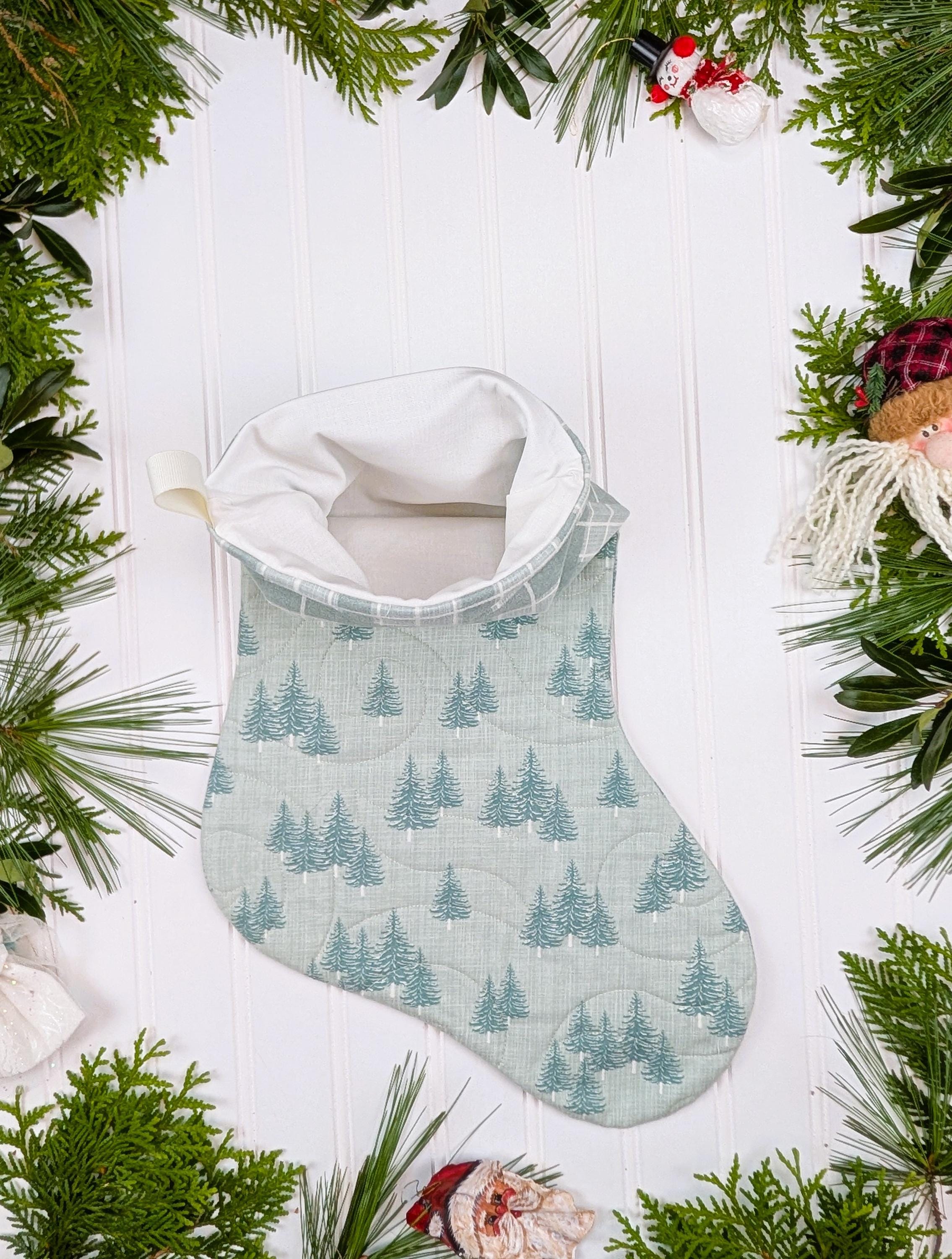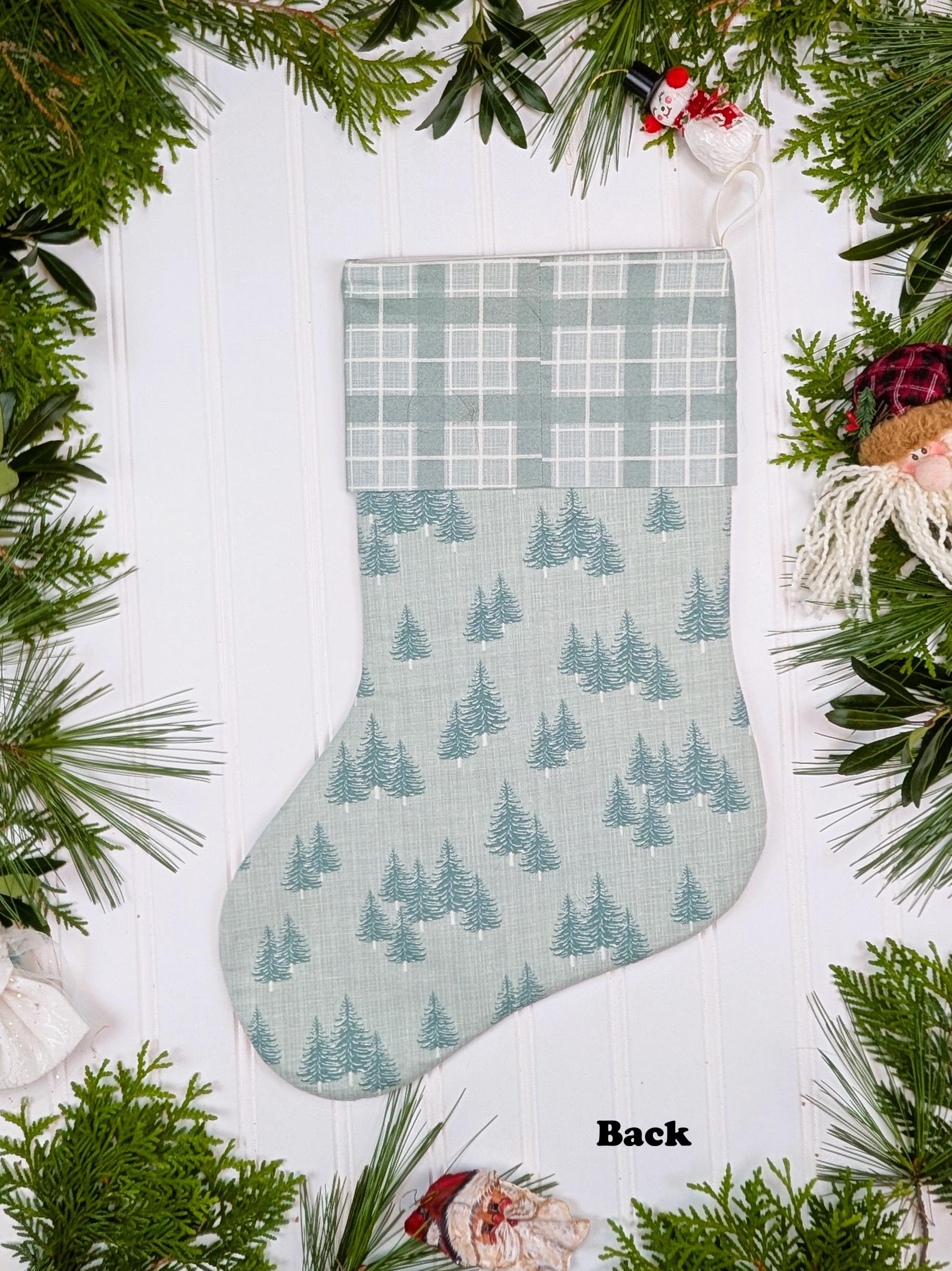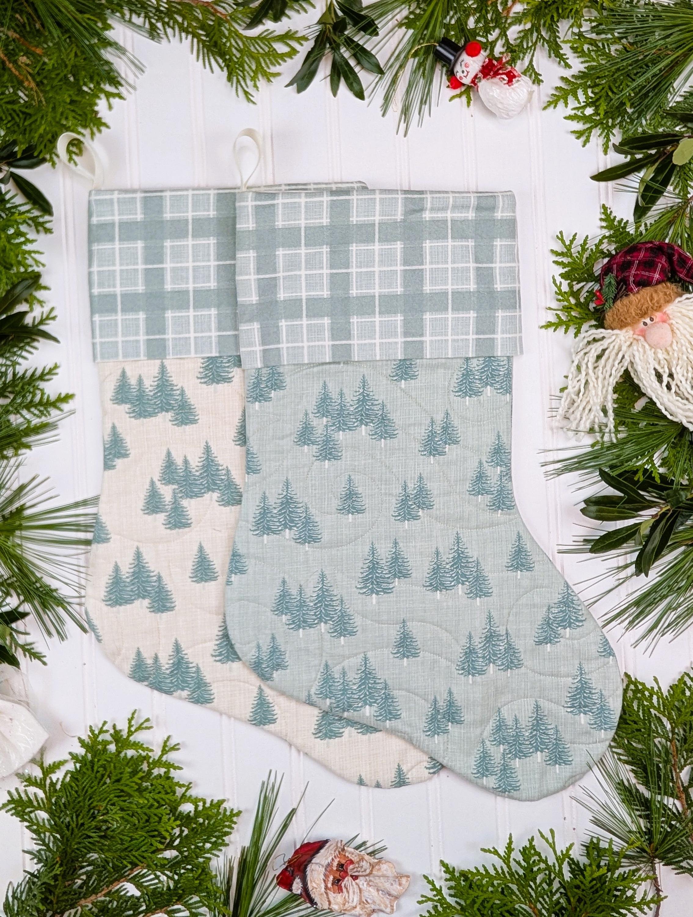 Fully lined and made from high quality quilt cotton fabric. The front of the stockings is quilted. The back of the stockings is not quilted (this makes the stocking keep its shape better). The poly batting used for the quilted front is Quilter’s Dream Green that is 100% recycled from plastic bottles. Hanging loop is made from polyester ribbon. Fabric is Juniper by Kate and Birdie for Moda which is a brushed cotton. Brushed cotton is almost like flannel but not as thick.
